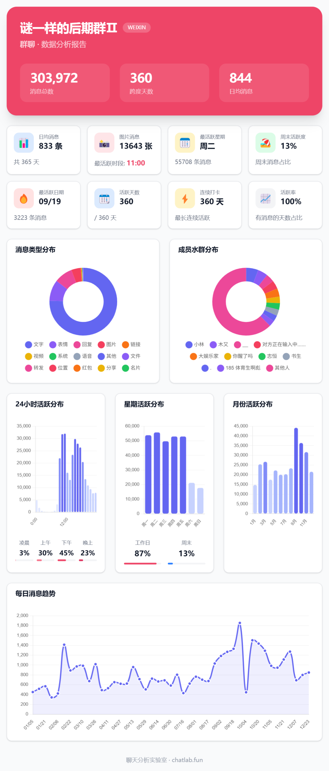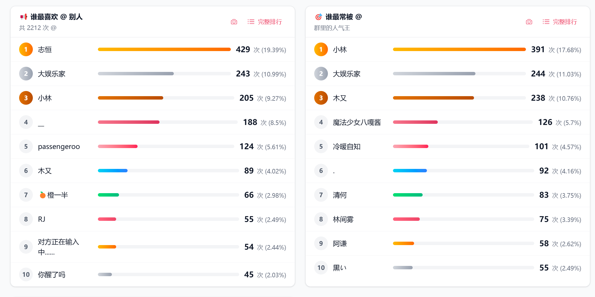 去年的时候使用github上的 留痕 导出的记录,做的分析,去年的文章链接:年底了,做一个微信群聊的年度报告(附源码) 但是由于腾讯的投诉,留痕 项目作者删除了代码。 并且今年微信更新了4.x版本,原有的方案也失效了。 以下是当前可行的方案,兼容最新的4.x版本微信。 文章只做软件的分享,具体使用方式参考对应项目的教程即可。 不直接提供下载链接,根据名字自动搜索即可。 一共三步: 1、【wx_key】获取微信数据库密钥和提取缓存图片的解密密钥。 2、【EchoTrace】导出聊天记录。 3、【ChatLab】详细的分析结果。 预览效果: 声明:本站所有文章,如无特殊说明或标注,均为本站原创发布。任何个人或组织,在未征得本站同意时,禁止复制、盗用、采集、发布本站内容到任何网站、书籍等各类媒体平台。如若本站内容侵犯了原著者的合法权益,可联系我们进行处理。